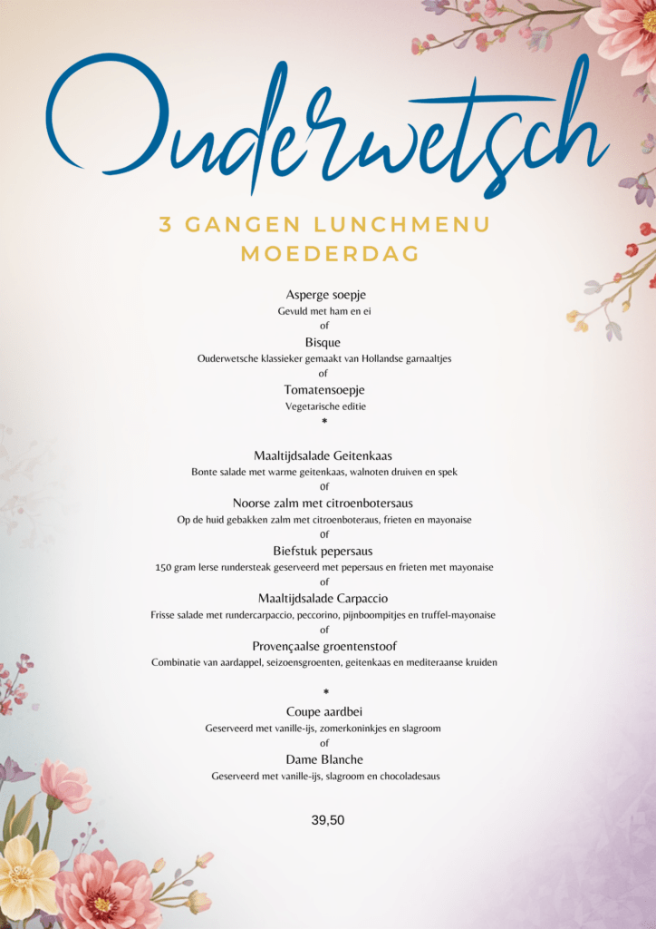We zijn geopend voor lunch en diner vanaf 12:00 uur! Maandag en dinsdag zijn wij gesloten. Reserveer jouw tafel bij Restaurant Ouderwetsch en laat ons je meenemen op een culinaire reis vol smaak, gezelligheid en hartelijke gastvrijheid.